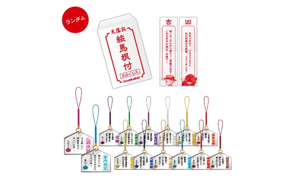 ※「天落記絵馬根付(おみくじ入)」「エンブレムピンバッジ 安全ピン ver.(秘密結社マニュアル付き)」を
