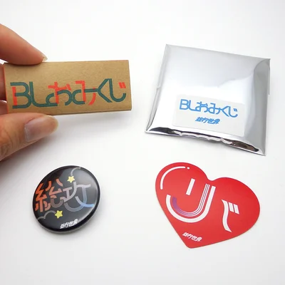 おみくじと同じロゴを使用した缶バッジ、シールとの3点セットです。