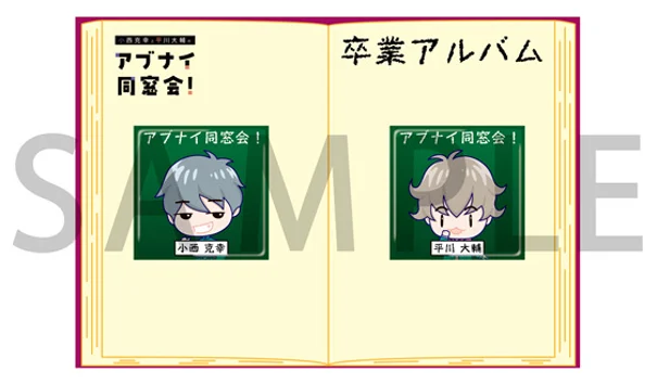 卒業写真風のペア缶バッチと、卒業アルバム風の台紙となっております。