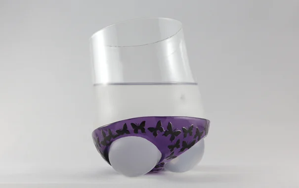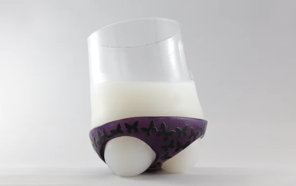 パンティを履いたグラス、パンティグラスです。無色透明のグラス部分は、カルピスを入れると白いお肌、ミルクティーを入れると焼けたお肌に早変わり。