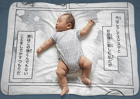 赤ちゃんの寝姿がマンガの1コマに早変わり!? セリフやナレーションがお昼寝姿とマッチして独自の1コマストーリーが完成する "ブランケット式コミック" が誕生しました。お昼寝中の赤ちゃんを真上から撮影するだけで、誰でも簡単にお子様を「マンガデビュー」させることができてしまう新感覚のブランケットです。