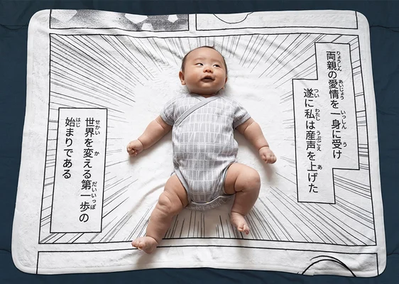 赤ちゃんの寝姿がマンガの1コマに早変わり!? セリフやナレーションがお昼寝姿とマッチして独自の1コマストーリーが完成する "ブランケット式コミック" が誕生しました。お昼寝中の赤ちゃんを真上から撮影するだけで、誰でも簡単にお子様を「マンガデビュー」させることができてしまう新感覚のブランケットです。