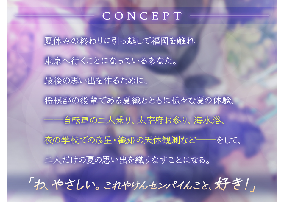 夏の環境音に、声優様の優しいボイスを重ねてヒーリングミュージックのように使える、癒しの音声コンテンツです。
