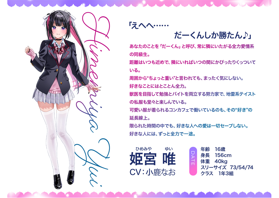16歳。あなたのことを「だーくん」と呼び、常に隣にいたがる全力愛情系の同級生。